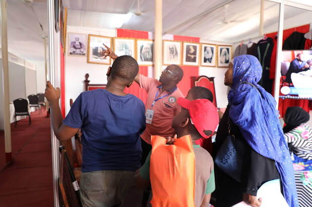 Baadhi ya wananchi wanaotembelea Banda la Miaka 100 ya Mahakama Kuu ya Tanzania wakipewa maelezo ya historia ya Mahakama na Hakimu Mkazi Mhe. Kifungu Mrisho kwenye Maonyesho ya 45 ya Kibiashara ya Kitaifa Jijini Dar es salaam