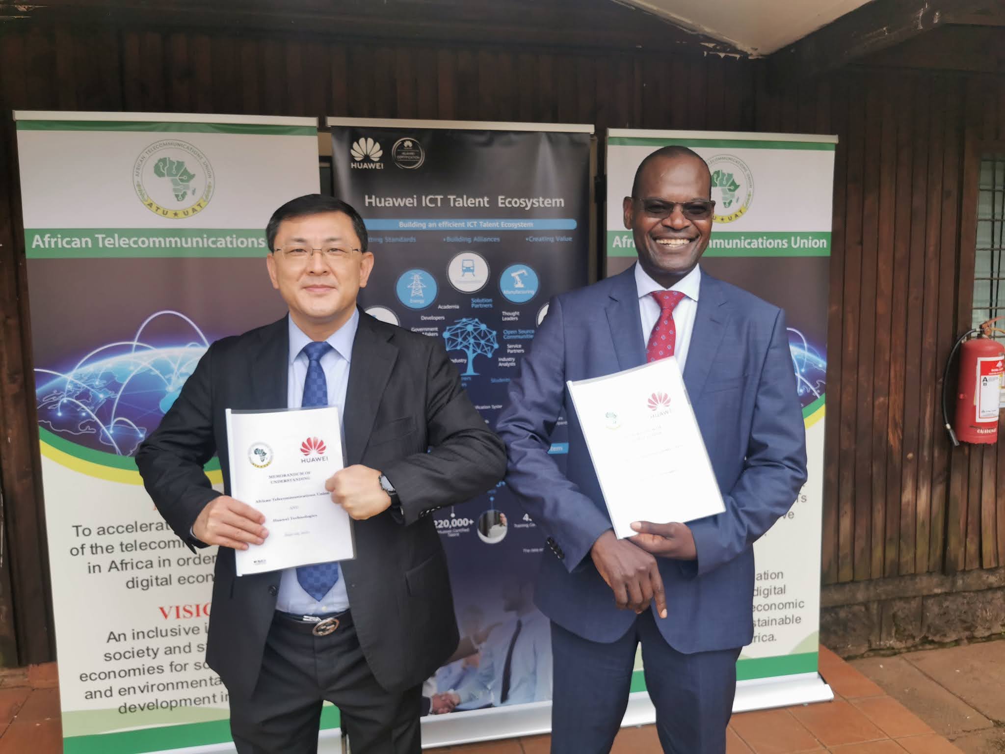 Makamu wa Rais wa Huawei Kusini mwa Afrika Samuel Chen (kushoto) na Katibu Mkuu wa Jumuiya ya Mawasiliano ya Afrika (ATU) Bw. John Omo wakionesha makubaliano hayo mbele ya waandishi wa habari.