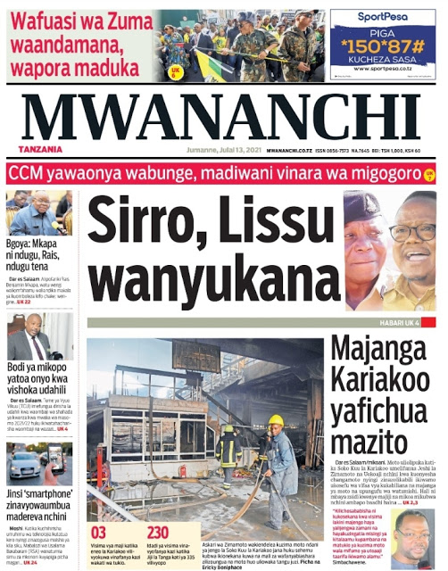 MagazetiPITIA VICHWA VYA HABARI KATIKA MAGAZETI YA LEO JULY 13,2021 Last updated: 2021/07/13 at 3:45 AM Alex Sonna 4 years ago Share SHARE Alex Sonna July 13, 2021 July 13, 2021 Share this Article Facebook Twitter Email Print Previous Article SHAKA AMPA POLE BI.TUMPALE KILASI KWA KUFIWA NA MUME WAKE KADA WA CCM Next Article MBUNGE MTATURU AONGOZA HARAMBEE UJENZI WA MADARASA IKUNGI, AJITOSA KUCHANGIA MILIONI 5