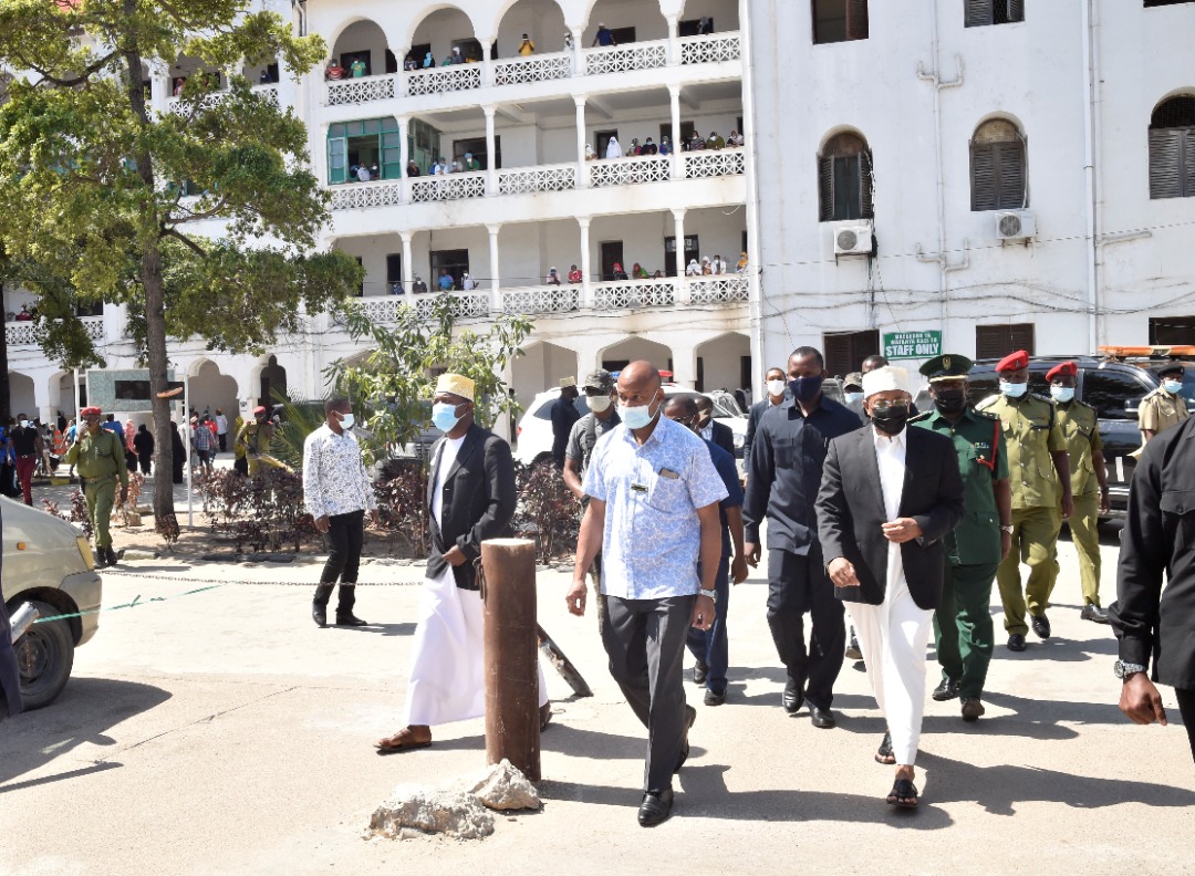 RAIS wa Zanzibar na Mwenyekiti wa Baraza la Mapinduzi Mhe.Dk.Hussein Ali Mwinyi akiongozana na Mkurugenzi Mtendaji wa Hospitali Kuu ya Mnazi Mmoja.Dr.Msafiri Marijani, alipowasili katika viwanja vya Hospitali Kuu ya Mnazi Mmoja kuwatembelea na kuwajulia hali Wagonjwa waliolazwa katika Hospitali hiyo.(Picha na Ikulu)
