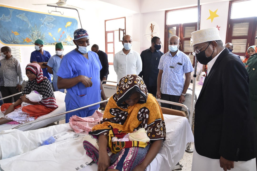 RAIS wa Zanzibar na Mwenyekiti wa Baraza la Mapinduzi Mhe.Dk.Hussein Ali Mwinyi akimjulia hali Mtoto Samir Haji akiwa amepakatwa na Mama yake Bi. Zulfa Vuai Mwinyi, alipotembelea Wodi ya Watoto katika jengo la Taasisi ya ‘ Neurosurgical Institute’ katika Hopitali Kuu ya Mnazi Mmoja Jijini Zanzibar.(Picha na Ikulu)