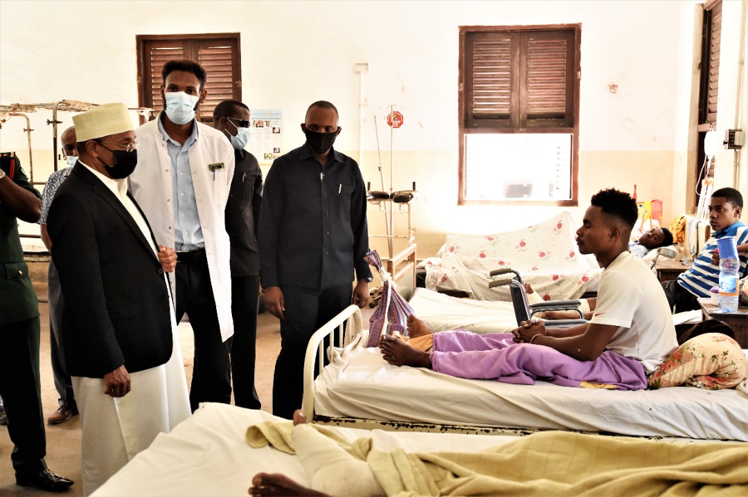 RAIS wa Zanzibar na Mwenyekiti wa Baraza la Mapinduzi Mhe.Dk.Hussein Ali Mwinyi akimjulia hali mmoja wa Wagonjwa waliolazwa katika Hospitali ya Mnazi Mmoja Ndg. Said Mussa, aliyelazwa katika Wodi ya Wagonjwa wa mifupa. (Picha na Ikulu)