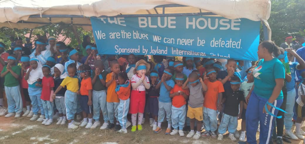 Wanafunzi wa Blue House wa shule ya Kimataifa ya Joyland ya Toangoma wakishuhudia michezo mbalimbali iliyokuwa ikiendelea kwenye Bonanza la shule hiyo lililofanyika leo kwenye viwanja vya shule hiyo Toangoma Kigamboni Dar es Salaam.