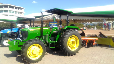 Waziri wa Kilimo Prof.Adolf Mkenda akimkabidhi ufunguo Dickson Tesha ikiwa ni ishara ya kumkabidhi trekta aina ya New Holland lenye thamani ya sh. mil. 46 mkopo uliotolewa na Kampuni ya PASS Leasing. Tesha amepokea trekta hilo kwa niaba ya Japhet Ndebesi wa Chamwino, mkoani Dodoma.