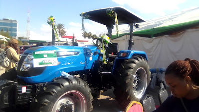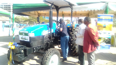 Waziri wa Kilimo Prof.Adolf Mkenda akimkabidhi ufunguo Dickson Tesha ikiwa ni ishara ya kumkabidhi trekta aina ya New Holland lenye thamani ya sh. mil. 46 mkopo uliotolewa na Kampuni ya PASS Leasing. Tesha amepokea trekta hilo kwa niaba ya Japhet Ndebesi wa Chamwino, mkoani Dodoma.