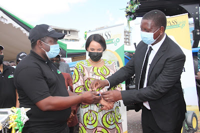 Waziri wa Kilimo Prof.Adolf Mkenda, akimkabidhi ufunguo Lillian Maricky wa Kampuni ya Magic LN Suppliers ya Chalinze, mkoani Pwani ikiwa ni ishara ya kumkabidhi mitambo ya kuvuna mpunga yenye thamani ya sh. mil.79 mkopo uliotolewa na Kampuni ya PASS Leasing. Anayeshuhudia katikati ni Mwenyekiti wa Bodi ya Wadhamini ya PASS Trust, Dkt. Tausi Kida.