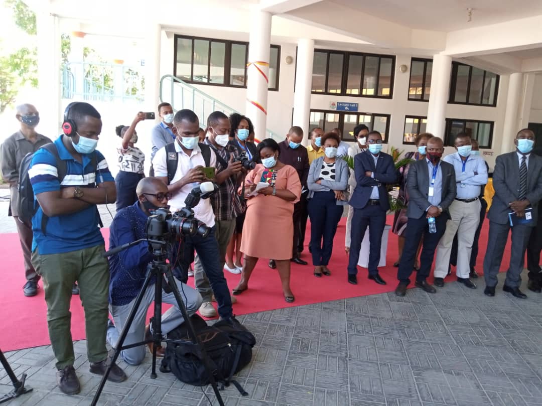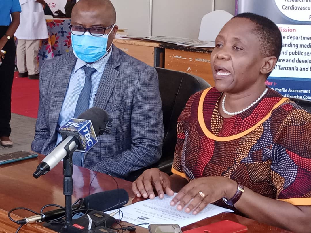 Waziri wa Afya, Maendeleo ya Jamii Jinsia Wazee na Watoto, Dr. Dorothy Gwajima akizungumza na waandishi wa habari leo katika Chuo Kikuu cha Sayansi Shirikishi Muhimbili MUHAS kuhusu uzinduzi wa Chanjo ya Uvico 19 ambapo kesho rais wa Jamhuri ya Muungano wa Tanzania Mh. Samia Suluhu Hassan atazindua rasmi. kulia ni Mkurugenzi wa Kinga katika Wizara ya Afya, Maendeleo ya Jamii Jinsia Wazee na Watoto, Dkt. Leonard Subi