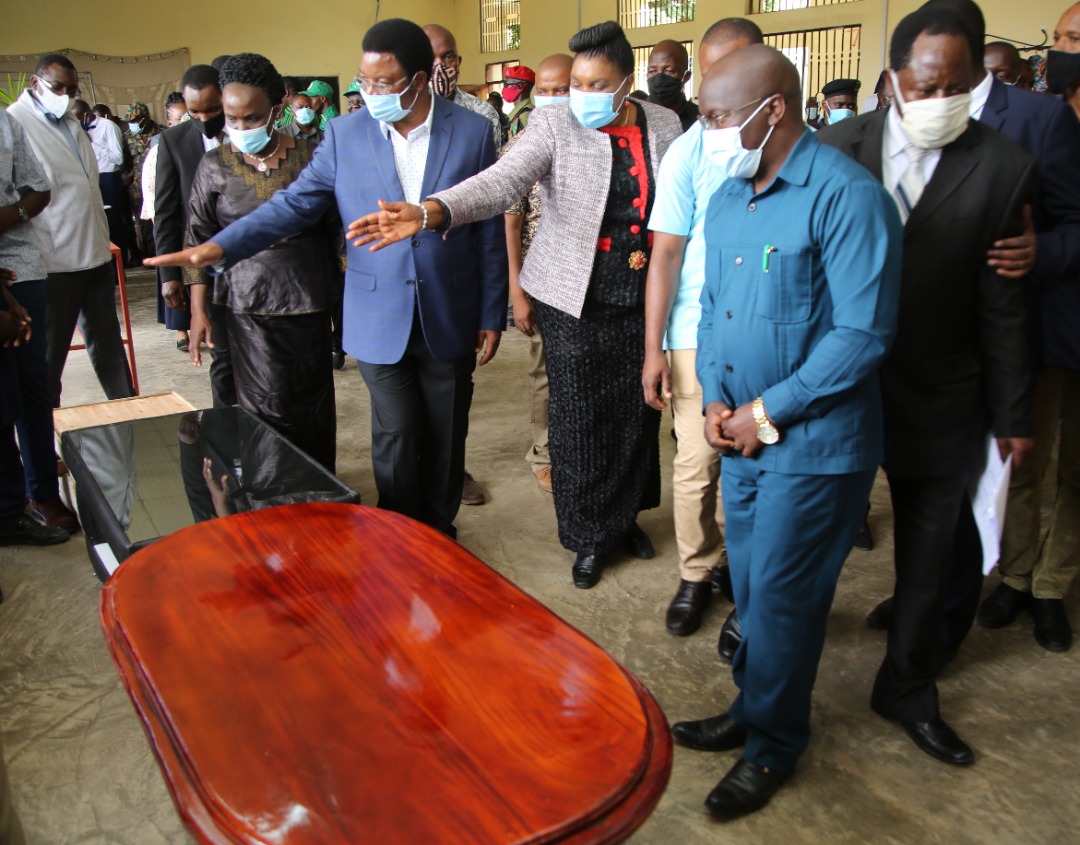 Waziri Mkuu, Kassim Majaliwa akitazama bidhaa mbalimbali zilizotengenezwa na wanachuo wa Chuo cha Kyela Polytechnic College College wakati alipotembelea Chuo hicho, Agosti 2, 2021. Kulia kwa Waziri Mkuu ni Waziri wa Elimu, Sayansi na Tekinolojia, Profesa Joyce Ndalichako na kushoto kwa Waziri Mkuu ni Waziri wa Nchi, Ofisi ya Waziri Mkuu Sera, Bunge, Kazi, Vijana, Ajira na Wenye Ulemavu, Jenista Mhagama.(Picha na Ofisi ya Waziri Mkuu)
