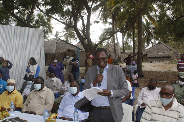 | Katibu Mkuu Sekta ya Uvuvi Dkt. Rashid Tamatamah akizungumza wakati wa ziara hiyo kushoto ni Waziri wa Mifugo na Uvuvi Mashimba Ndaki akifuatiwa na Mkuu wa wilaya ya Pangani |
