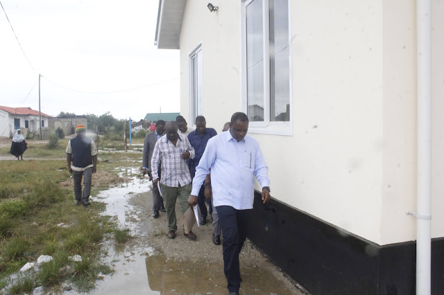 | Waziri wa Mifugo na Uvuvi Mashimba Ndaki akiendelea na ukaguzi wa Jengo la BMU Kijiji cha Zingibar |