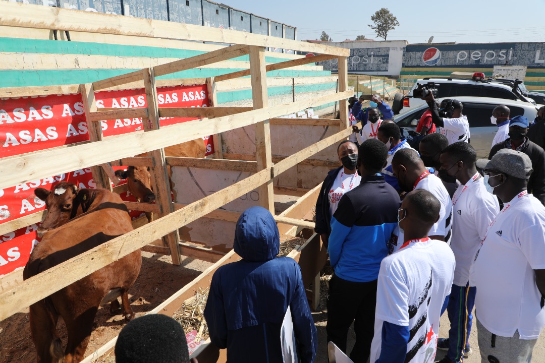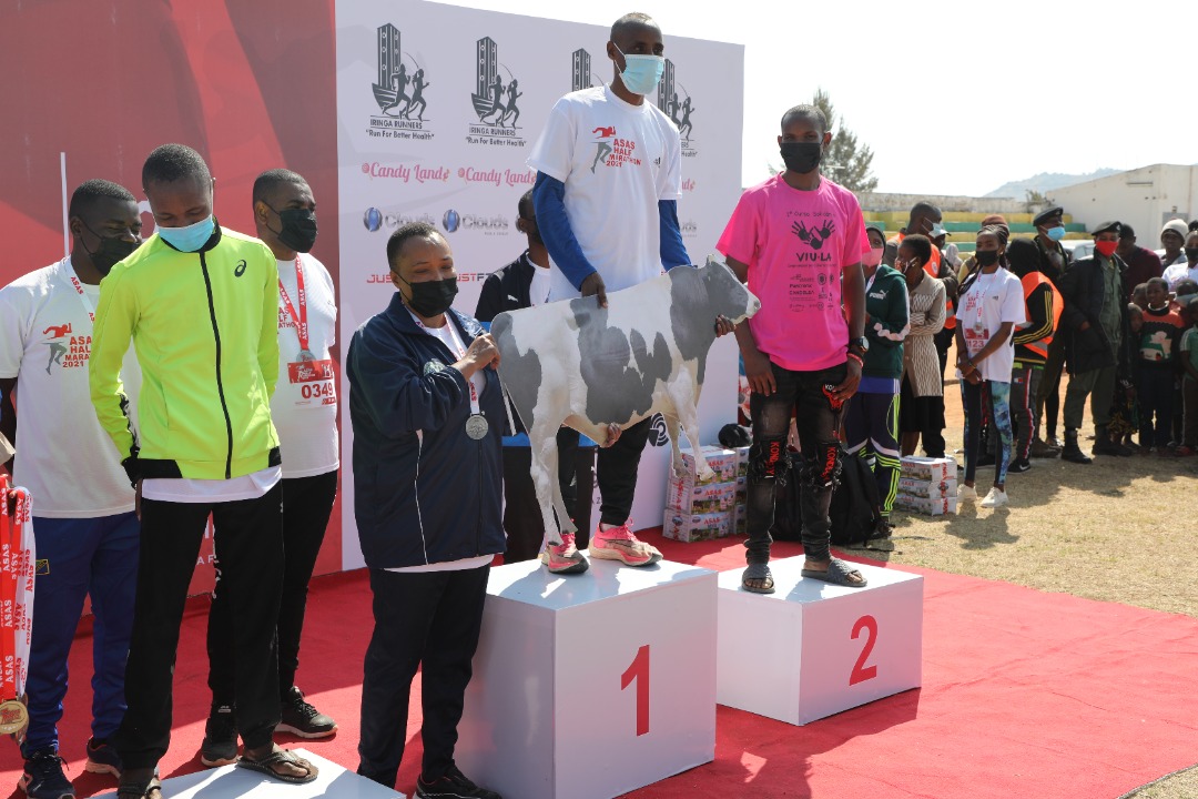 Naibu Waziri wa Habari, Utamaduni, Sanaa na Michezo Mhe. Pauline Gekul akiwa Ng’ombe wawili ambao wamekabidhiwa kwa washindi wa ASAS Half Marathon 2021 kwa washindi wa kwanza kilomita 21 wanaume wanaume na wanawake baada ya kuibuka bingwa wa mbio hizo.