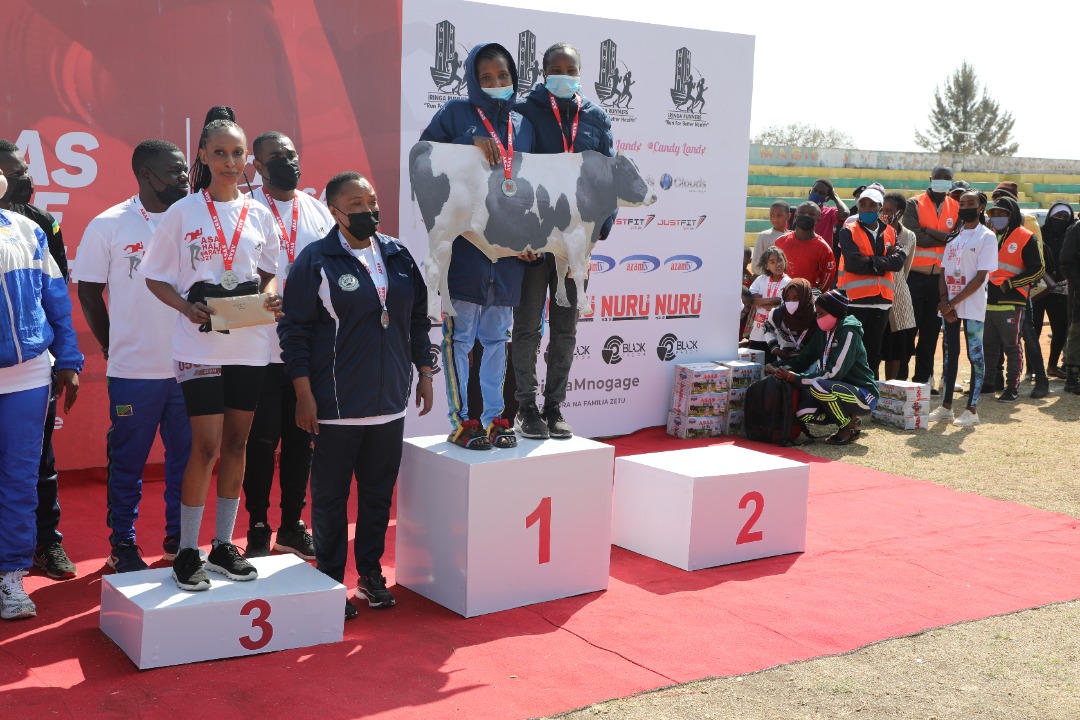 Naibu Waziri wa Habari, Utamaduni, Sanaa na Michezo Mhe. Pauline Gekul akiwa katika picha ya pamoja na washindi mara baada ya kumkabidhi mshindi wa kwanza kilomita 21 kwa wanawake Sara Hiti kutoka Manyara mfano wa picha ya Ng’ombe baada ya kuibuka bingwa wa mbio hizo.