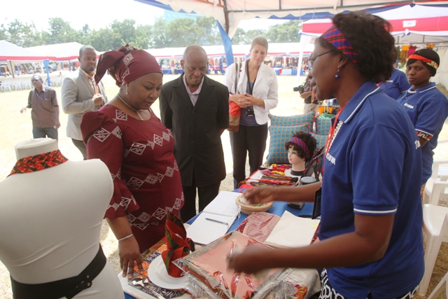 Waziri wa Nchi Ofisi ya Waziri Mkuu Mh.Jenista Mhagama akiwa na Katibu Mtendaji wa Baraza la Uwezeshaji Bibi Beng’I Issa wakisikiliza maelezo kutoka kwa mnufaika wa program za Uwezeshaji.