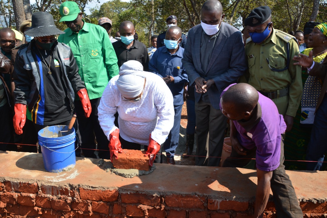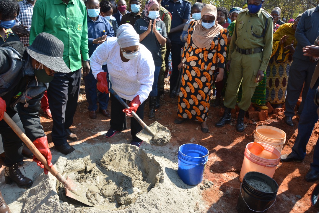 Naibu Waziri wa Afya, Maendeleo ya Jamii, Jinsia, Wazee na Watoto Mhe. Mwanaidi Ali Khamis akishiriki ujenzi wa katika zoezi la ujenzi wa jengo la Maabara ya Shule ya Sekondari Mdeme iliyopo Wilayani Mbinga mkoani Ruvuma.