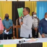 Waziri wa Maliasili na Utalii Dkt. Damas ndumbaro akiongea na menejimenti na wadau wa uhifadhi wa Faru katika eneo la Kreta ya Ngorongoro wakati wa uzinduzi wa zoezi la uwekaji alama za utambuzi kwa mnyama faru.
