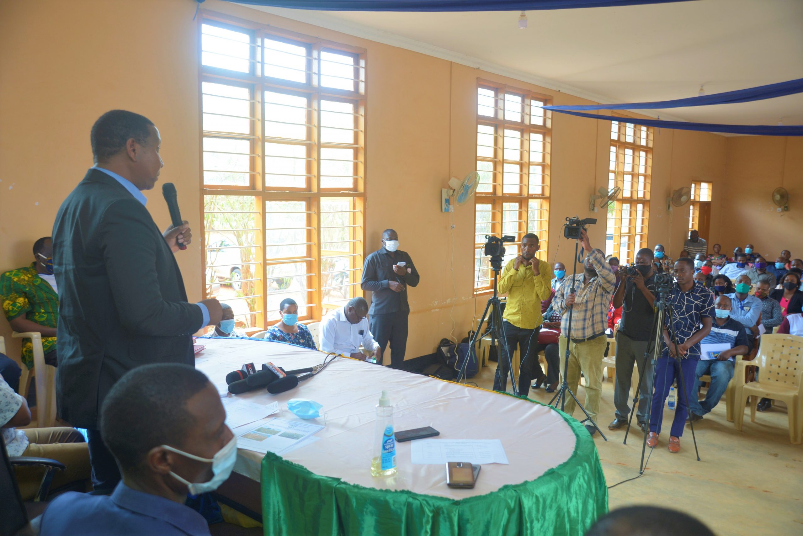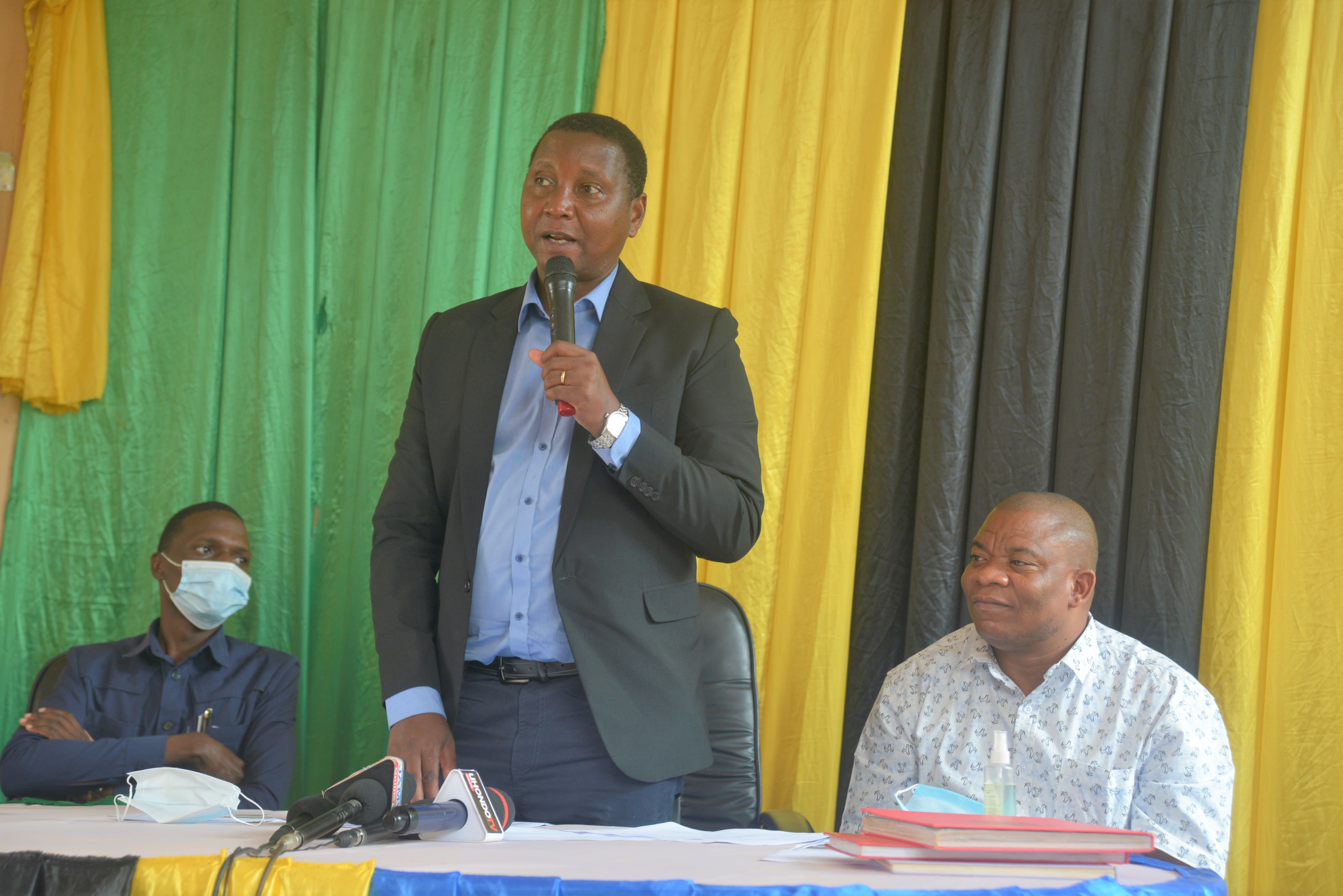 Waziri wa Kilimo Mhe. Prof. Adolf Mkenda (Mb) akisisitiza jambo wakati akizungumza na maafisa ugani wa Wilaya ya Kongwa wakati apokutana na kuzungumza nao katika kikao kazi wilayani humo katika Mkoa wa Dodoma, kilichofanyika katika ukumbi wa Halmashauri ya wilaya ya Kongwa Leo tarehe 17 Agosti 2021.