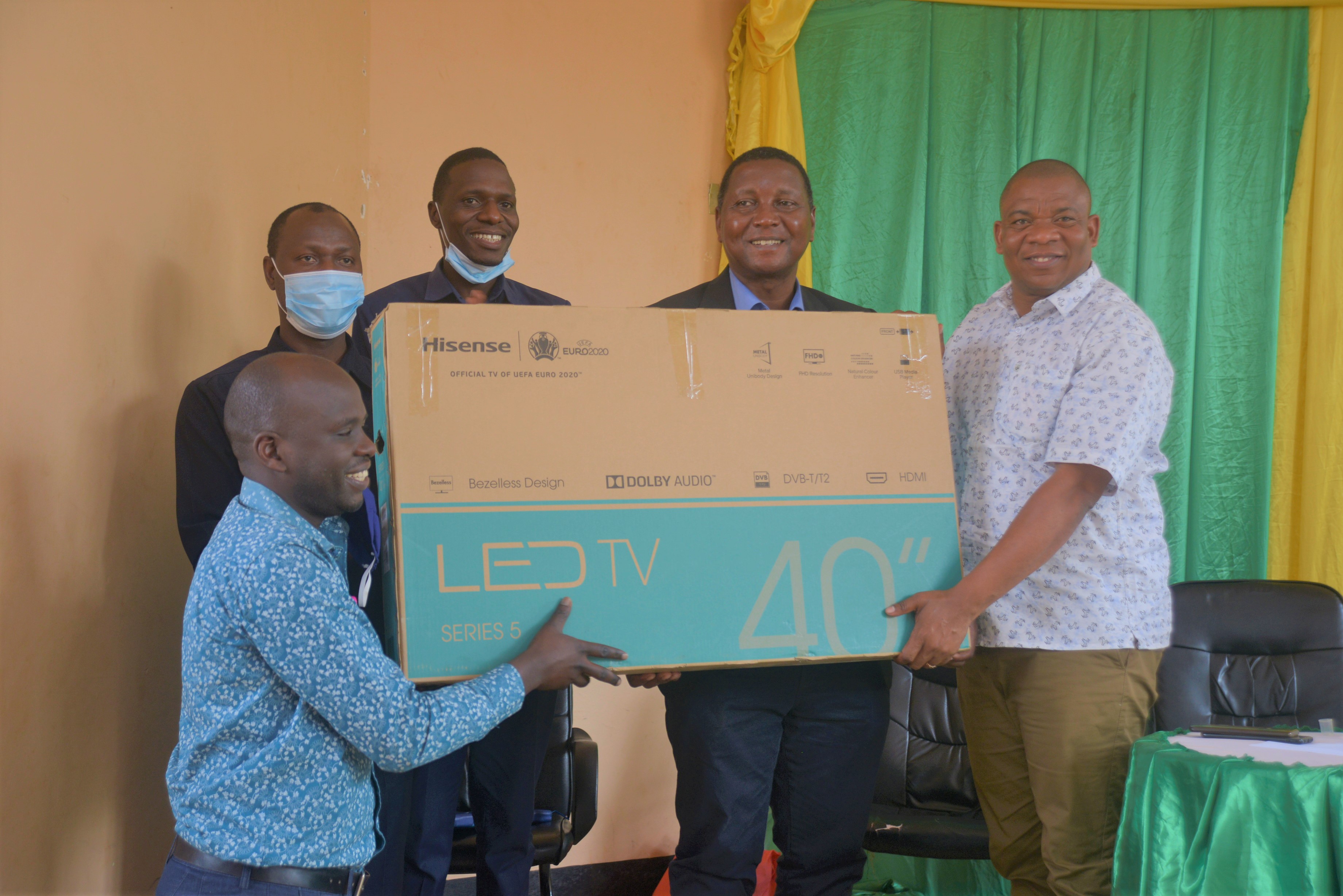 Waziri wa Kilimo Mhe. Prof. Adolf Mkenda (Mb) akiwa ameambatana na Mkuu wa Mkoa wa Dodoma Mhe Antony Mtaka wakimkabidhi zawadi ya Televisheni Afisa Ugani Kata ya Ng’humbi Ndg Charles Mujule kama kielelezo cha kufanya kazi kwa ufanisi wakati alipokutana na kuzungumza na maafisa ugani wa Wilaya ya Kongwa katika Mkoa wa Dodoma, kilichofanyika katika ukumbi wa Halmashauri ya wilaya ya Kongwa Leo tarehe 17 Agosti 2021.