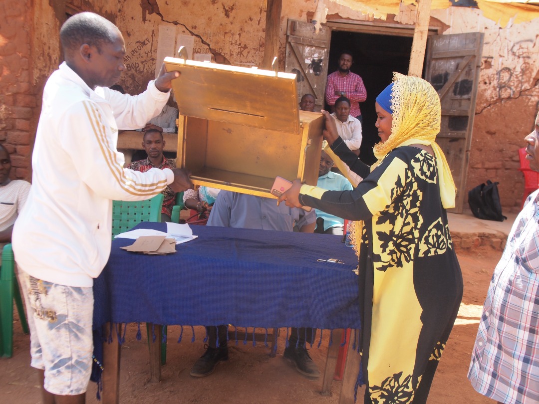 Wawakilishi wa wakulima wa mbaazi wa kijiji cha Semeni wilaya ya Tunduru mkoani Ruvuma ambao majina yao hayakupatikana wakionesha sanduku lenye Barua za makampuni yaliyoomba kununua mbaazi katika mnada wa pili uliofanyika katika kijiji hicho jana ambapo zaidi ya tani 1,400 zimeuzwa.