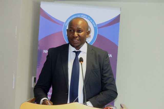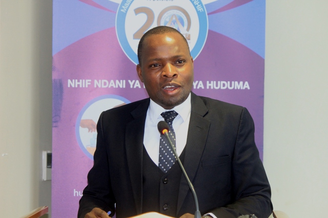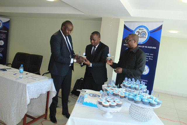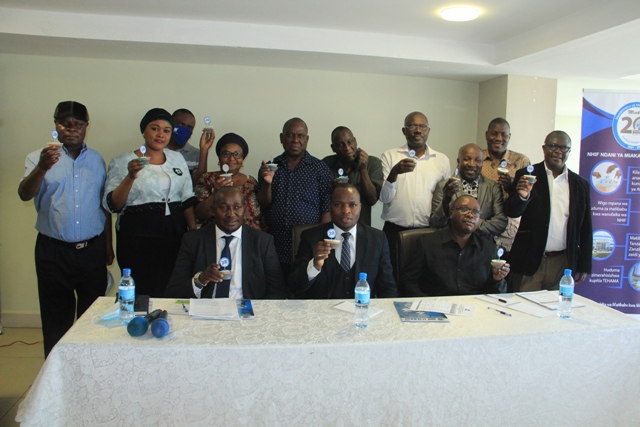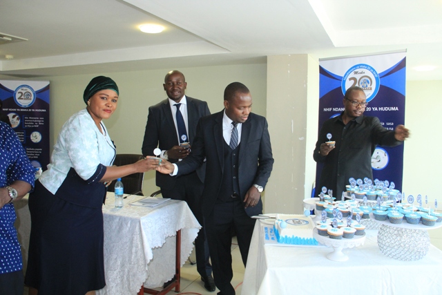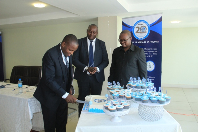 Mkurugenzi wa Idara ya Habari Maelezo na Msemaji Mkuu wa Serikali Bw. Gerson Msigwa, Mkurugenzi Mkuu wa Mfuko wa Taifa wa Bima ya Afya (NHIF) Bw. Bernald Konga na na Mwenyekiti wa Jukwaa la Wahariri (TEF) Bw. Deodatus Balile wakibadilishana keki kuashiria maadhimisho ya miaka 20 tangu kuanzishwa kwa (NHF) nchini Tanzania.