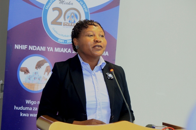 Meneja Uhusiano wa Mfuko wa Taifa wa Bima ya Afya (NHIF) Angella Mziray akiwasilisha ratiba ya kikao kazi hicho kinachofanyika kwenye ukumbi wa PSSSF jijini Dododma leo.