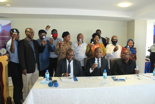 Mkurugenzi wa Idara ya Habari Maelezo na Msemaji Mkuu wa Serikali Bw. Gerson Msigwa, Mkurugenzi Mkuu wa Mfuko wa Taifa wa Bima ya Afya (NHIF) Bw. Bernald Konga na na Mwenyekiti wa Jukwaa la Wahariri (TEF) Bw. Deodatus Balile wakiwa katika picha ya pamoja na wahariri mbalimbali waazilishi walioandika habari na makala mbalimbali wakati (NHIF) ikianzishwa nchini Tanzania.