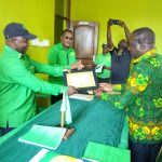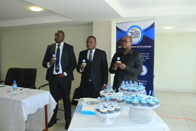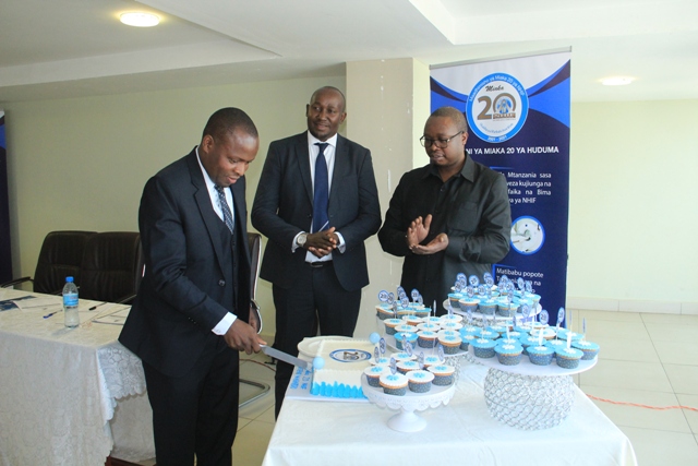 Mkurugenzi wa Idara ya Habari Maelezo na Msemaji Mkuu wa Serikali Bw. Gerson Msigwa, Mkurugenzi Mkuu wa Mfuko wa Taifa wa Bima ya Afya (NHIF) Bw. Bernald Konga na na Mwenyekiti wa Jukwaa la Wahariri (TEF) Bw. Deodatus Balile wakibadilishana keki kuashiria maadhimisho ya miaka 20 tangu kuanzishwa kwa (NHF) nchini Tanzania.