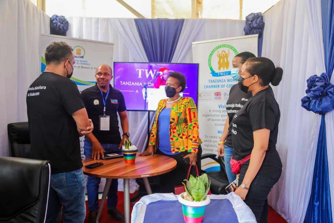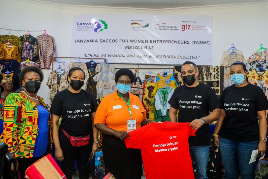 Mkurugenzi wa Kitengo cha Vodacom Business ndani ya kampuni ya teknolojia na mawasiliano ya Vodacom Tanzania PLC Arjun Dhilon (kulia) akimkabidhi fulana Mkurugenzi na Mwanzilishi wa Tanzania Saccos Women Entrepreneurs (TASWE Saccos) Anna Matinde wakati wa maonyesho ya bidhaa za wajasiriamali Tanzania wenye lengo la kukuza biashara zao kupitia kampeni ya kampuni hiyo ya Pamoja Tukuze Biashara Yako iliyo chini ya muunganiko wa kidunia wa ‘SheMeansBusiness’