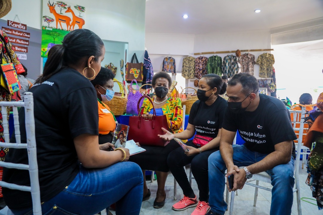 Mkurugenzi wa Kitengo Vodacom Business ndani ya kampuni ya teknolojia na mawasiliano ya Vodacom Tanzania PLC Arjun Dhilon (kulia) akiwasikiliza wajasiriamali wanawake wakati wa maonyesho ya bidhaa za wajasiriamali Tanzania wenye lengo la kukuza biashara zao kupitia kampeni ya kampuni hiyo ya Pamoja Tukuze Biashara Yako iliyo chini ya muunganiko wa kidunia wa ‘SheMeansBusiness’