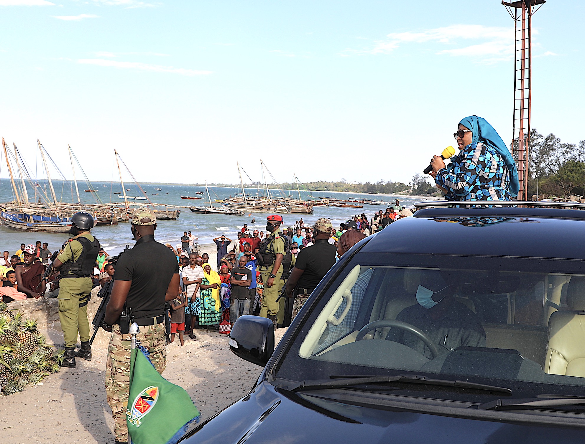 Rais wa Jamhuri ya Muungano wa Tanzania Mhe. Samia Suluhu Hassan, akisalimiana na Wananchi wa Bagamoyo Mkoani Pwani leo Sept 02,2021 alipowasili katika Eneo la Uvuvi Bagamoyo kwa ajili ya kuendelea kurekodi kipindi maarufu cha Royal Tour kitakachotangaza Utalii, Biashara na Uwekezaji Nchini. PICHA NA IKULU