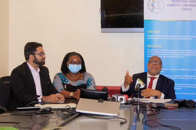 Katibu Mkuu wa Taasisi ya Watafiti na wanataaluma wa Vinasaba vya Binadamu Tanzania,Mohamed Zahir akitoa ufafanuazi katika mkutano huo kulia ni Mwenyekiti wa Taasisi ya Watafiti na wanataaluma wa Vinasaba vya Binadamu Tanzania Siana Nkya.