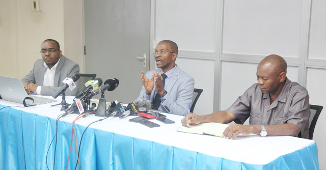 Mkurugenzi wa Huduma za Utabiri wa TMA, Dk. Hamza Kabelwa akizungumza na waandishi wa habari akitoa mwelekeo wa msimu wa mvua za vuli za Oktoba hadi Disemba 2021. Kushoto ni Meneja wa Kituo cha Huduma za Utabiri wa TMA, Samuel Mbuya.