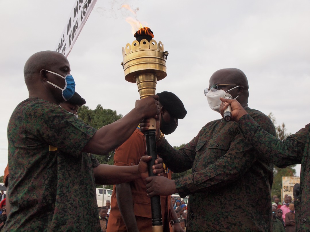 Mkuu wa mkoa wa Ruvuma Brigadia Jenerali Wilbert Ibuge kushoto,akipokea Mwenge wa Uhuru kutoka kwa Mkuu wa mkoa wa Mtwara Brigadia Jenerali Marco Gaguti katika kijiji cha Sauti Moja wilaya ya Tunduru mkoani Mtwara baada ya Mwenge wa Uhuru kumaliza mbio zake mkoani Mtwara.
