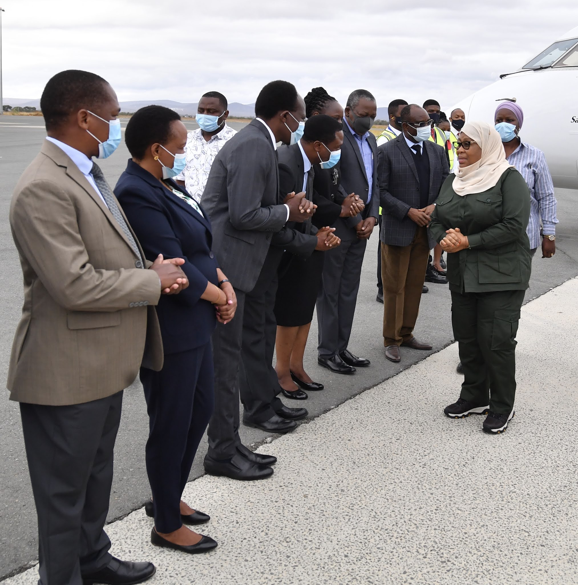 Rais wa Jamhuri ya Muungano wa Tanzania Mhe. Samia Suluhu Hassan akisalimiana na viongozi mbalimbali mara baada ya kuwasili katika Uwanja wa Ndege wa Kimataifa wa Kilimanjaro (KIA) kwa ajili ya kuendelea kurekodi kipindi maarufu ya Royal Tour leo tarehe 05 Septemba 2021.