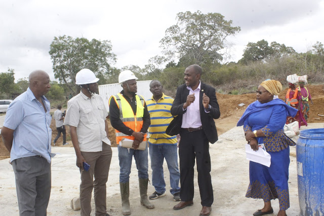 KAIMU Mkurugenzi Mkuu wa Bodi ya Korosho Tanzania (CBT) Francis Alfred kushsoto akimsikiliza kwa umakini Kaimu Mkurugenzi Mtendaji wa kampuni ya Out Growers Tanzania Limited Reginali Mpolo wakati wa ziara hiyo (aliyevaa rifleta) mara baada ya kuwasili katika eneo la ujenzi huo
