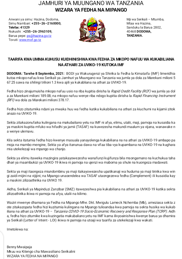 BiasharaIMF YAIPATIA TANZANIA DOLA MILIONI 567.3 KWA AJILI YA KUKABILIANA NA ATHARI ZA UVIKO 19 Last updated: 2021/09/08 at 2:05 PM John Bukuku 4 years ago Share SHARE John Bukuku September 8, 2021 September 8, 2021 Share this Article Facebook Twitter Email Print Previous Article WATU WATANO WAFARIKI DUNIA KATIKA AJALI MKOANI ARUSHA Next Article BENKI YA TADB YATOA SH. BIL.281.74 KUENDELEZA KILIMO
