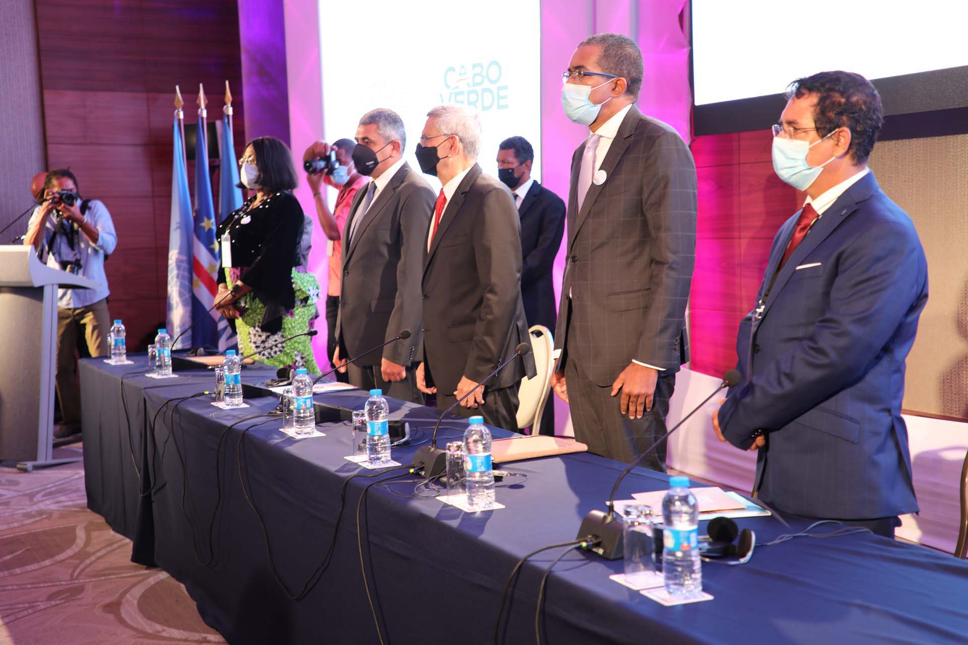 Katibu Mkuu wa Shirika la Umoja wa Mataifa la Utalii, Zurab Pololikashvili ( wa pili kushoto) akiwa na baadhi ya Viongozi wa Cape Verde wakiwa wamesimama mara wakiimba wimbo wa taifa wa taifa hili katika Mkutano wa Kimataifa wa 64 wa Utalii Kanda ya Afrika uliomamalizika kufanyika nchini humo, Wa pili kulia ni Waziri wa Utalii nchin Cape Verde, Mhe. Carlos Santos
