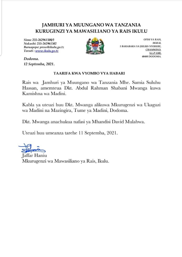 MchanganyikoRAIS SAMIA AMTEUA DKT.ABDUL RAHMAN SHABANI MWANGA KUWA KAMISHNA WA MADINI Last updated: 2021/09/12 at 6:28 PM joseph 4 years ago Share SHARE joseph September 12, 2021 September 12, 2021 Share this Article Facebook Twitter Email Print Previous Article LOCAL EMPLOYEES GREATLY OUTNUMBER EXPATRIATES IN THE ONGOING RUVU PROJECT Next Article RAIS SAMIA AFANYA UTEUZI WA VINGOZI MBALIMBALI