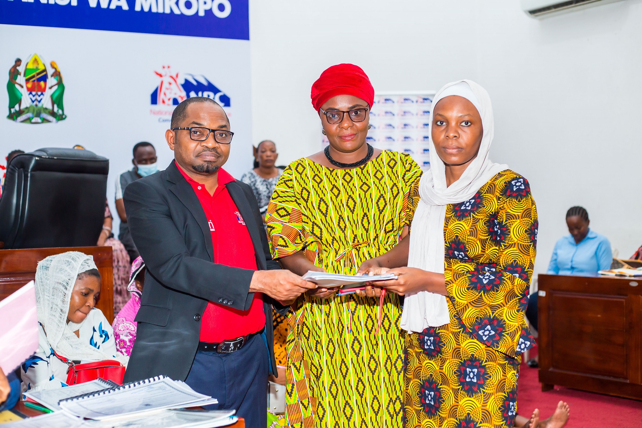 Meneja Ukuzaji Biashara wa Benki ya NBC Bw Isdory Sebastian (Kushoto) na Afisa Maendeleo ya Vijana kutoka Halmashauri ya jiji la Dar es Salaam Bi Sapiencia Masaga (Katikati) wakikabidhi cheti ushiriki wa mafunzo ya biashara, elimu ya fedha na mikopo kwa mmoja wa wajasiriamali Bi Najma Yusuph (Kulia) wakati wa semina fupi ya mafunzo ya ujasiriamali iliyoandaliwa na Halmashauri ya Manispaa ya Ilala kwa kushirikiana na Benki hiyo ikilenga kuwaandaa wajasiriamali hao waweze kutumia vema mikopo na fursa mbalimbali zinazotolewa na serikali pamoja na manispaa hiyo.