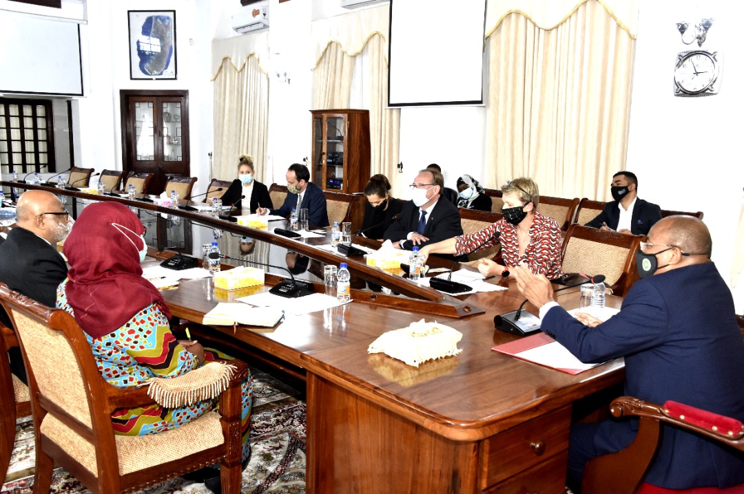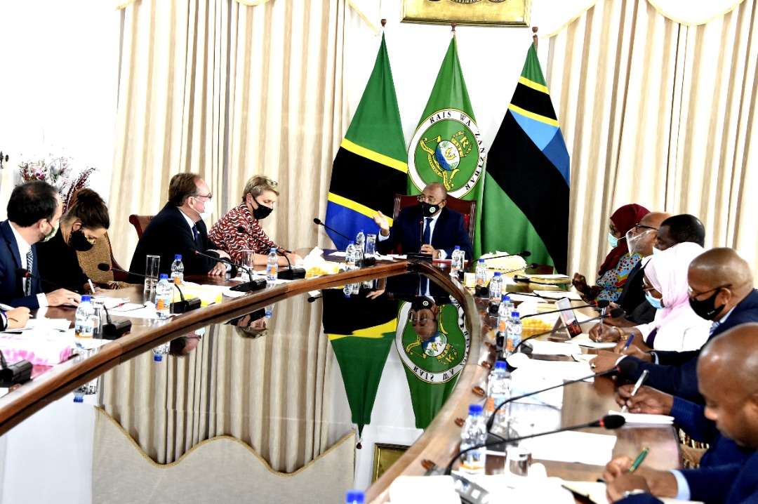 Rais wa Zanzibar na Mwenyekiti wa Baraza la mapinduzi Dk.Hussein Ali Mwinyi (katikati) alipokuwa katika mazungumzo na Ujumbe kutoka Wizara ya Mambo ya Nje ya Ujerumani alipokutana nao leo katika ukumbi wa Ikulu Jijini Zanzibar katika mazungumzo hayo Mawaziri wa Serikali ya Mapinduzi ya Zanzibar pamoja na Watendaji walijumuika katika mazungumzo hayo.[Picha na Ikulu] 16/09/2021.