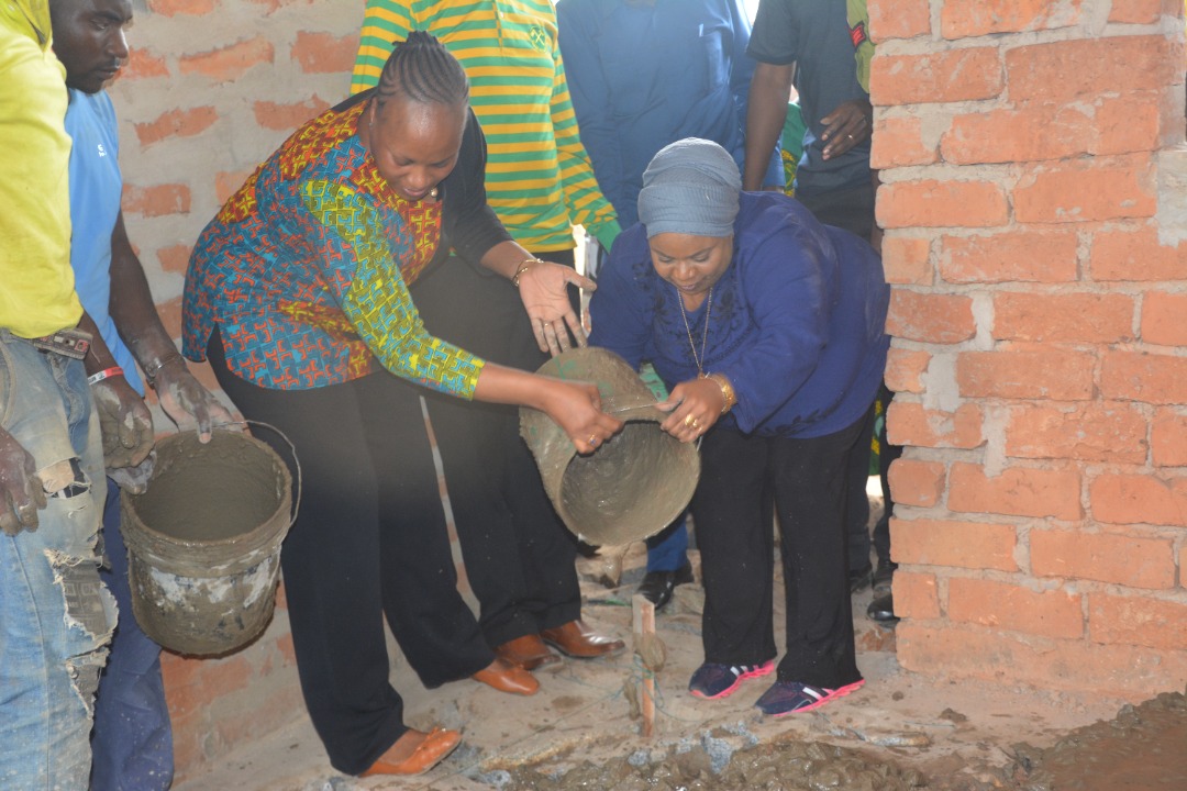 Naibu Waziri wa Afya, Maendeleo ya Jamii, Jinsia, Wazee na Watoto, Mhe. Mwanaidi Ali Khamis (Mwenye kiremba) pamoja na Mkuu wa Wilaya ya Biharamulo Kemilembe Lwota (kulia) wakishiriki katika kuchangia nguvu zao katika miradi ya maendeleo kwa kuchanganya zege kwa ajili ya ujenzi wa Zahanati ya Kaniha, Wilayani Biharamulo, Kagera.