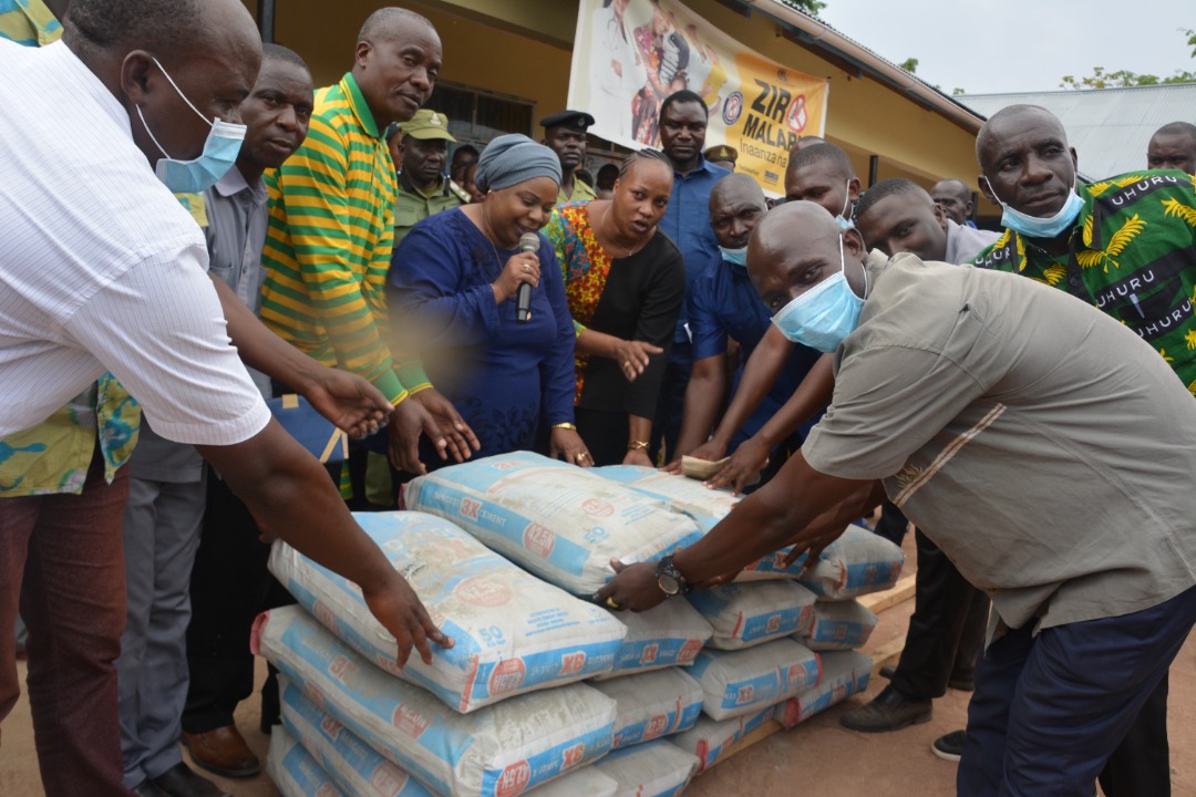 Naibu Waziri wa Afya, Maendeleo ya Jamii, Jinsia, Wazee na Watoto Mhe. Mwanaidi Ali Khamis (Mwenye kiremba) akikabidhi mifuko ya Saruji ikiwa ni mchango wake katika Ujenzi wa Zahanati ya Kijiji cha Kaniha, Wilaya Biharamulo Mkoani Kagera.