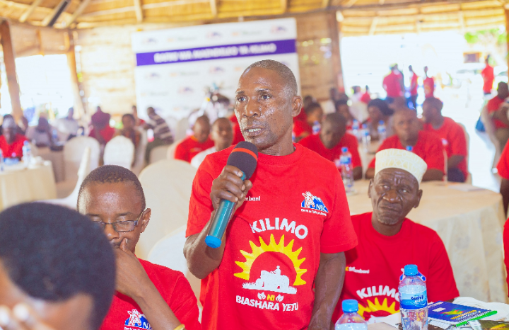 Mmoja wa wadau wa zao la korosho kutoka mkoani Lindi akizungumza wakati wa uzinduzi wa kampeni ya ‘Vuna zaidi na NBC Shambani’ mahususi kwa wakulima wa korosho mikoa ya Lindi na Mtwara.