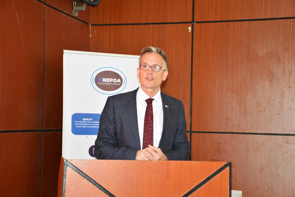 Balozi wa Uingereza nchini Mhe. David Concar akihutubia wadau walioshiriki kongamano la Kitaifa kuhusu upatikanaji wa Rasilimali za kusaidia utekelezaji wa Mikakati ya Taifa ya Kukabiliana na Mabadiliko ya Tabianchi. Mhe. Balozi amesisitiza kuendelea kushirikiana na Tanzania katika jitihada za kukabiliana na athari za Mabadiliko ya Tabianchi.