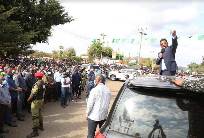 Waziri Mkuu, Kassim Majaliwa akiwasalimia wananchi wa Himo wilayani Moshi Vijijini ambao walijitokeza kwa wingi barabarani na kumfanya alazimike kusimama na kuwasalimia Septemba 23, 2021. Alikuwa akienda Kiraracha nyumba kwa Mwenyekiti wa Chama cha TLP, Augustine Mrema kutoa pole kwa kifo cha Mke wa Mwanasiasa huo, Rose Mrema aliyefariki dunia, Septemba 16, 2021. (Picha na Ofisi ya Waziri Mkuu)
