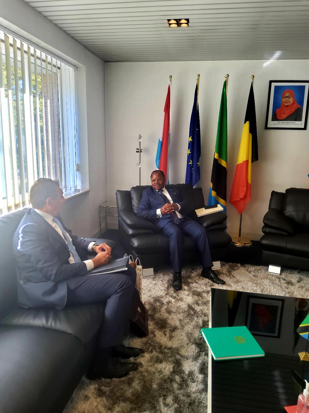 Balozi wa Tanzania nchini Ubelgiji, Mhe. Jestas A. Nyamanga wakikabidhiana zawadi baada ya kufanya mazungumzo na Mkuu wa ukanda wa nchi