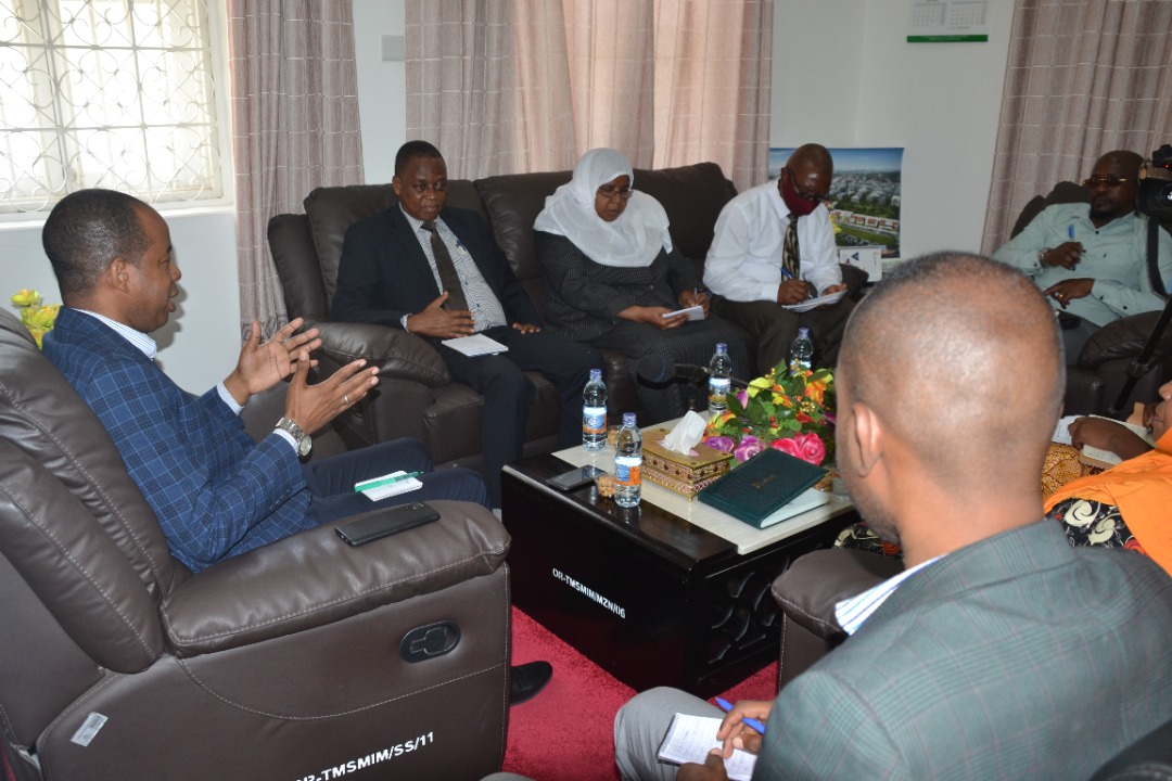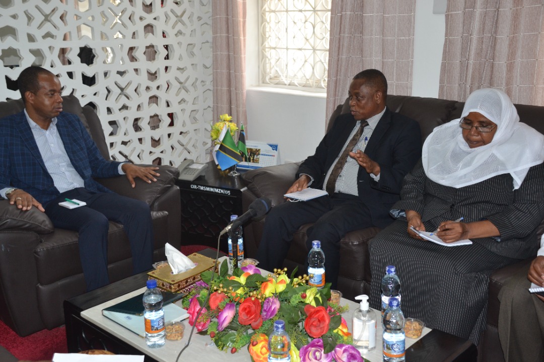 Mwenyekiti Tume ya Haki za Binaadamu na Utawala Bora Mathew Mwaimu akimweleza Wazri wa Nchi Afisi ya Rais Tawala za Mikoa na Idara Maalum za SMZ Masoud Ali mohammed lengo la ujio wao katika Ofisi hizo .