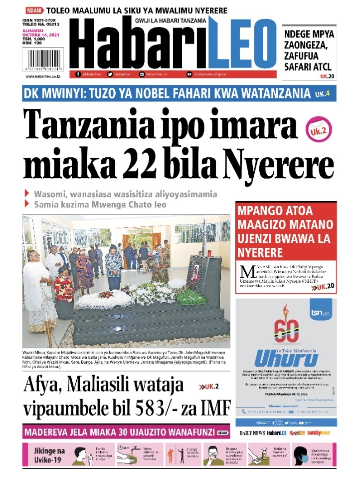 MagazetiPITIA VICHWA VYA HABARI KATIKA MAGAZETI YA LEO OCTOBER 14,2021 Last updated: 2021/10/14 at 2:20 AM Alex Sonna 4 years ago Share SHARE Alex Sonna October 14, 2021 October 14, 2021 Share this Article Facebook Twitter Email Print Previous Article MUFTI AHIMIZA WAISLAMU KULINDA AMANI NA USHIRIKIANO WA DINI ZINGINE Next Article ONESHO LA VYAKULA VYA AFYA NA LISHE LAFANYIKA KIJIJI CHA USARE MKOANI KILIMANJARO