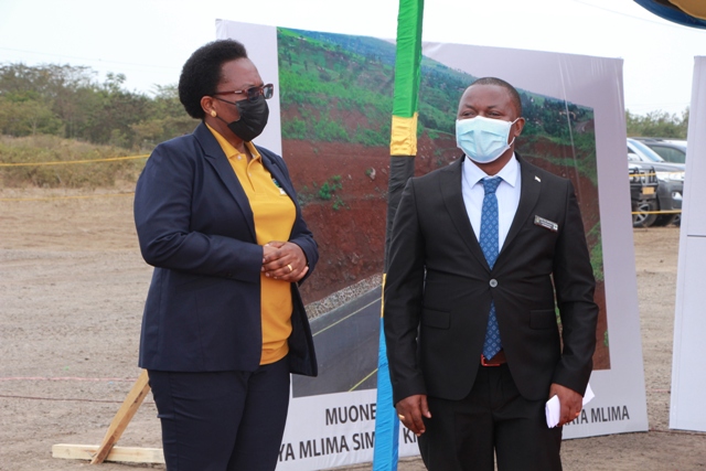 Mtendaji Mkuu wa Wakala wa barabara Tanzania TANROADS Eng. Rogatus Mativila na Meneja wa TANROADS Mkoa wa Kilimanjaro Eng. Motta Kyando wakiwa katika hafla hiyo ambapo Rais Samia Suluhu Hassan alizindua rasmi Barabara ya Lami yenye urefu wa kilomita 32.2 katika eneo la Sanya Juu Wilayani Siha Mkoani Kilimanjaro