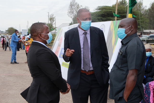 Katibu Mkuu wa Wizara ya Ujenzi na Uchukuzi (Sekta ya Ujenzi)Mhandisi Joseph Malongo akijailiana jambo na Mtendaji Mkuu wa Wakala wa barabara Tanzania TANROADS Eng. Rogatus Mativila kushoto na Mh.Suleiman Kakoso Mwenyekiti wa Kamati ya Bunge ya kudumu ya Miundombinu katika hafla ya uzinduzi wa barabara ya Sanya Juu wilayani Hai.