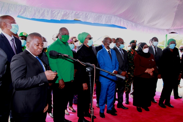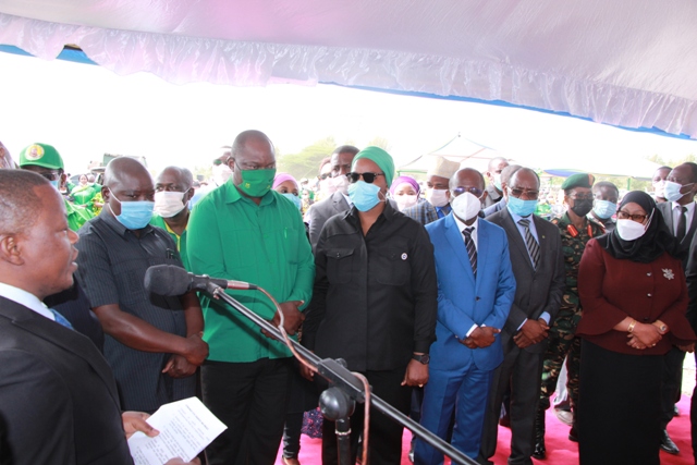 Rais wa Jamhuri ya Muungano wa Tanzania Mhe. Samia Suluhu Hassan, akisikiliza taarifa ya mradi huo kutoka kwa Mtendaji Mkuu wa Wakala wa barabara Tanzania TANROADS Eng. Rogatus Mativila alipozindua rasmi Barabara ya Lami yenye urefu wa kilomita 32.2 katika eneo la Sanya Juu Wilayani Siha Mkoani Kilimanjaro
